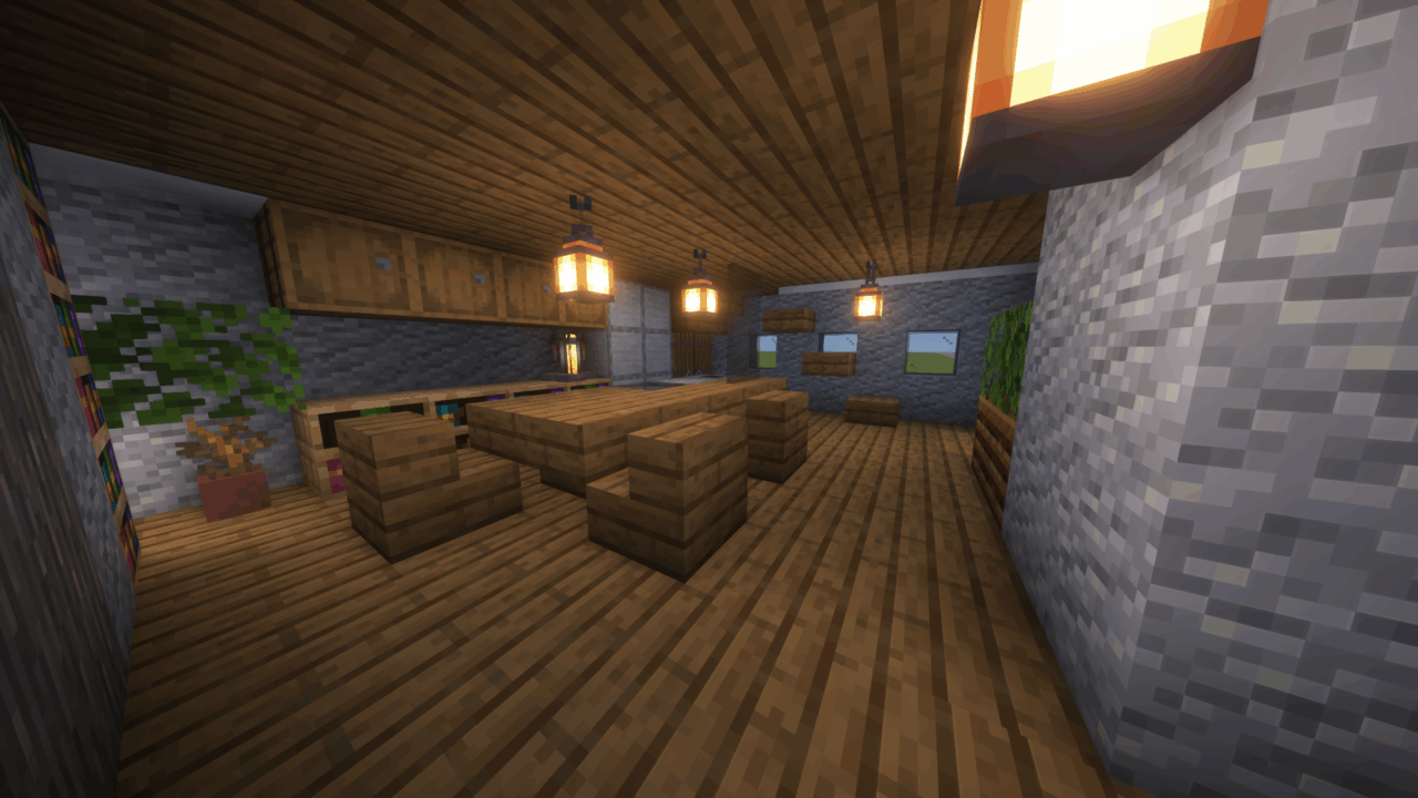 内装1階 | 植木鉢+枯れ木+オークの葉 トウヒの階段 模様入りの本棚 ランタン 樽 燻製機 かまど 大釜 滑らかな石 コンポスター+オークの葉 トウヒのドア |