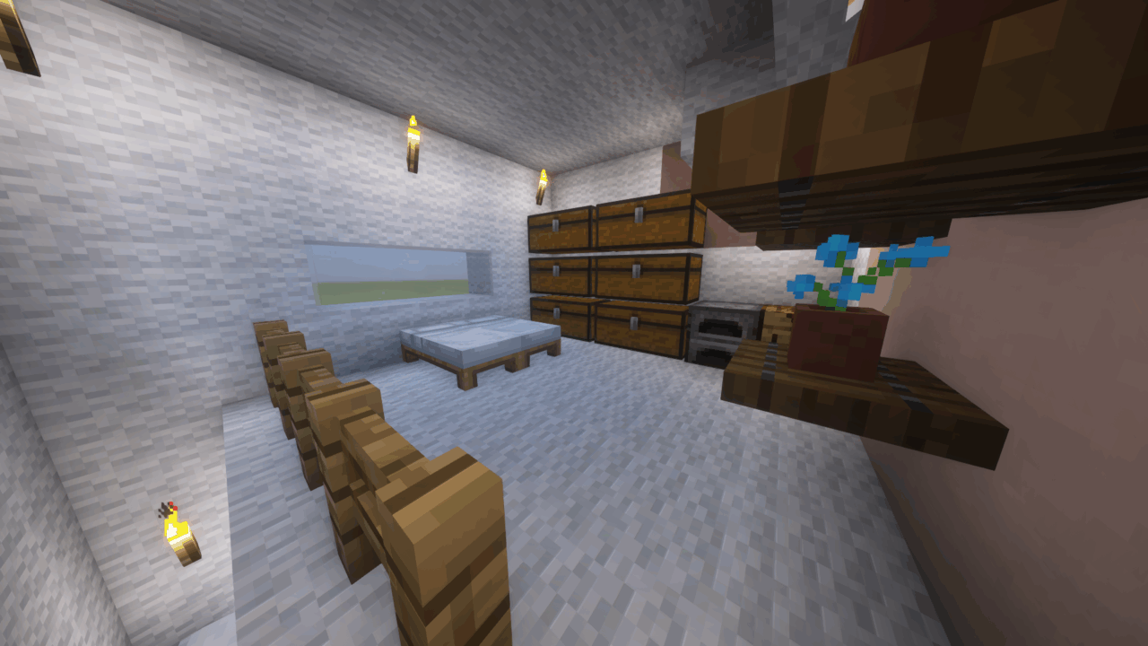 内装2階 | チェスト 白色のベッド かまど 作業台 トウヒのトラップドア 植木鉢+花 |
